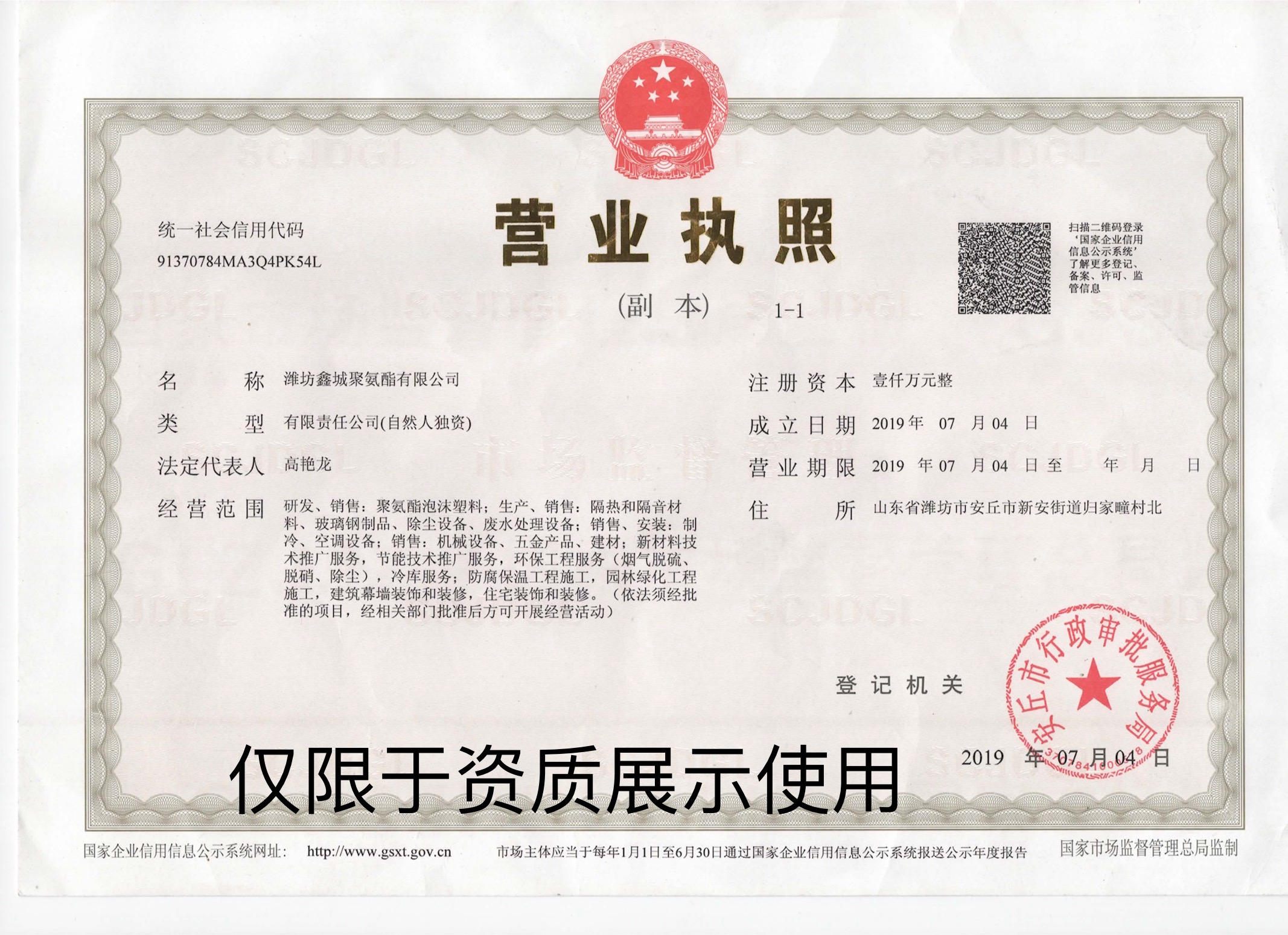 潍坊鑫城聚氨酯有限公司是一家研发、生产、销售、施工为一体的聚氨酯保温 公司 材料综合服务商,公司主要经营:硬泡组合聚醚、异氰酸酯(聚合MDI)、单体聚醚 等化工原料以及聚氨酯硬泡喷涂保温施工。公司位于国际风筝之都一潍坊市区南,北 临近济青高速,西临滩日高速,206国道自门前经过,地理位置优越,交通运输便利。 公司主营产品和服务主要应用于民用建筑、工业建筑、冷库建筑等的内外墙体隔 汽保温,以及养殖建筑隔热保温、石油及供热管道、储罐、船舱、客车、冷藏车、连 续板材、冷库门、车库门、冰箱、太阳能等填充型保温、隔热、隔音领域。 公司始终重视产品研发和质量管理控,不断进行产品创新,成立了独立研发检验实 验室,专业的研发设备和高层次的研发才,保证了产品配方先进,技术成熟,自主 研发的无氟组合聚醚及高阻燃硬质聚氨酯产品已成功投放市场,引领行业发展。公司 连续多次通过了国际ISO9001和ISO14001体系认证,产品通过多项国家级检测以及 取得《山东省建筑节能技术产品应用认定证书》,符合建筑节能要求。 作为具有国家建筑行业防水防腐保温工程贰级资质的专业工程承包商,公司拥有 专业化的保温工程施工团队,打造专业工程施工能力,采用国外先进的喷涂设备,可 从事冷库保温、外墙保温、管道保温、设备保温等聚氨酯保温工程,可为客户提供有 效的工程咨询,工程设计,工程采购,施工管理等综合服务。 公司秉承“诚信、合作、创新、共赢”的核心价值观,公司长期从事聚氨酯应用 的实践,具备广泛终端领域的技术储备和丰富的经验,能为不同的客户提供可靠的产 品及周到的服务支持。公司现有自主施工人员88人,可全国同时施工。 鑫城聚氨酯以卓越的技术、完善的服务,为客户提供完善可靠的硬质聚氨酯产品 和施工解决方案。